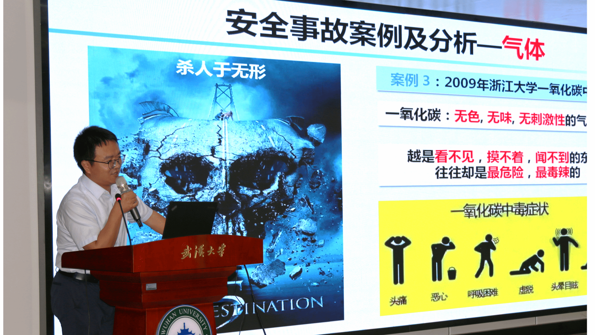 邹老师以《国内外化学实验室安全事故案例分析》为题,从火灾、气体、剧毒、防范措施四个方面对新生同学进行实验室安全教育,提醒同学们要在实验中做好个人防护品,规范试剂储存和实验要求。通过讲座,同学们深刻认识到做实验要警于思,合于规、慎于行。树立安全至上的意识才能保证生命安全和科研工作的顺利开展。