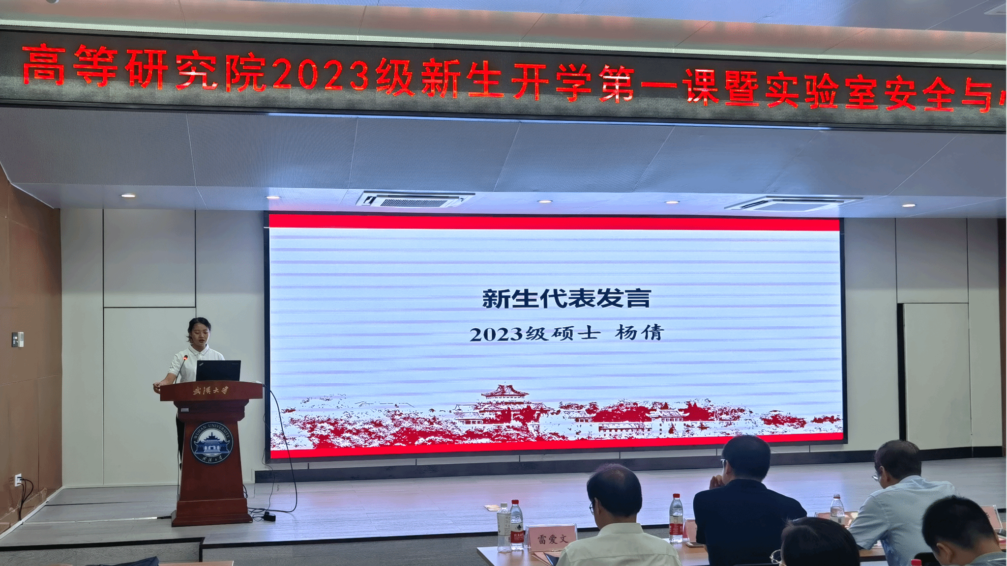2023级硕士新生代表杨倩发言。四年前结缘武大,如今梦圆高研院。杨倩同学牢记习近平总书记“广大青年生逢其时,也重任在肩。既是追梦者,也是圆梦人。”的殷切嘱托,鼓励大家潜心科研、追求真理,以平和的心态坚守自己的科研岗位,不断拓新基础科学的边界。