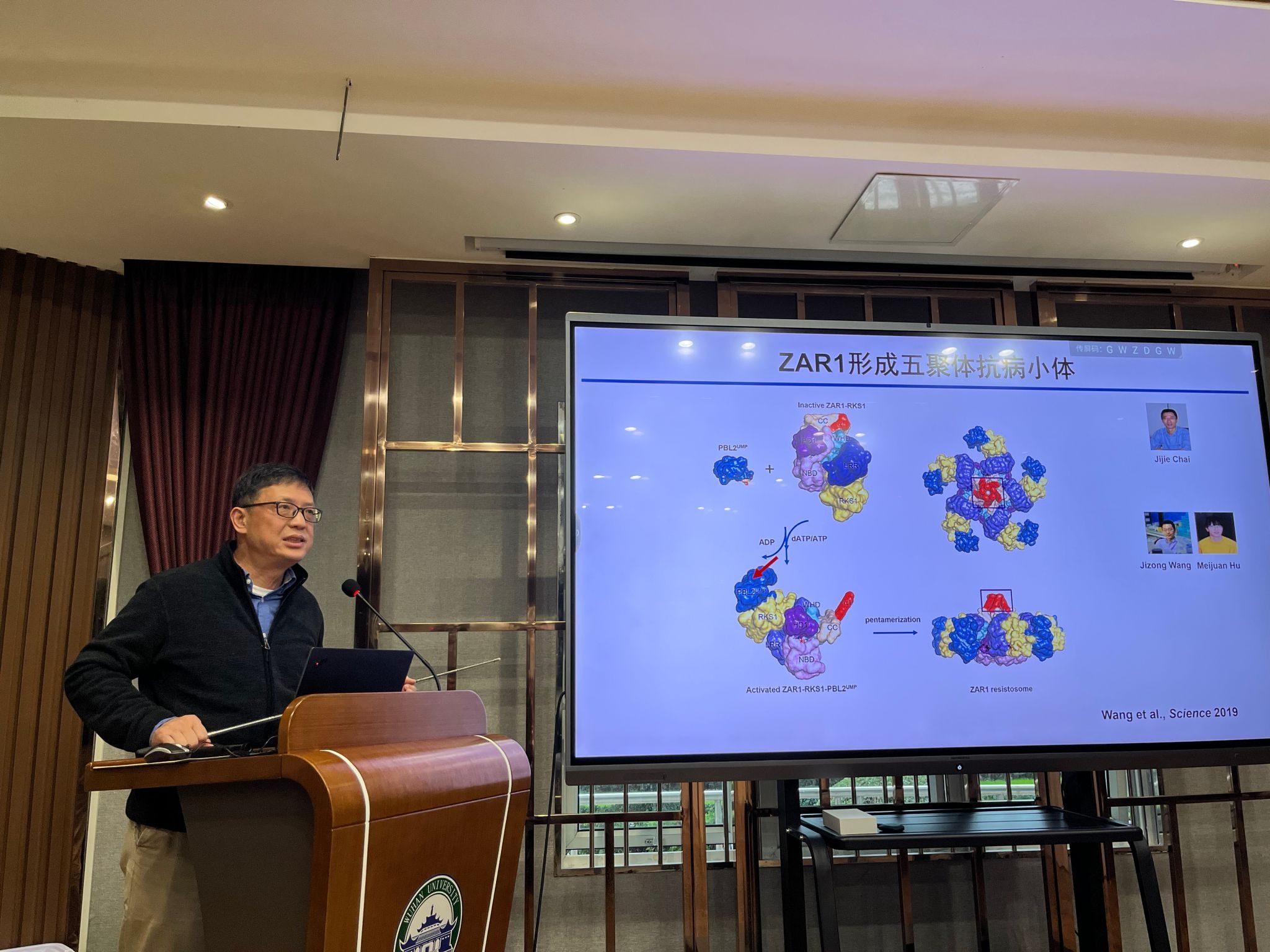 周老师向大家介绍了世界范围内病虫害对作物产量造成的巨大损失,强调了植物抗病研究的重要意义,阐述了植物抗病机制方面的基本理论。随后,周老师分享了其团队在抗病小体分子结构和功能、十字花科植物根肿病研究和植物抗病次生代谢物抗病机制方面取得的一系列重要研究成果。