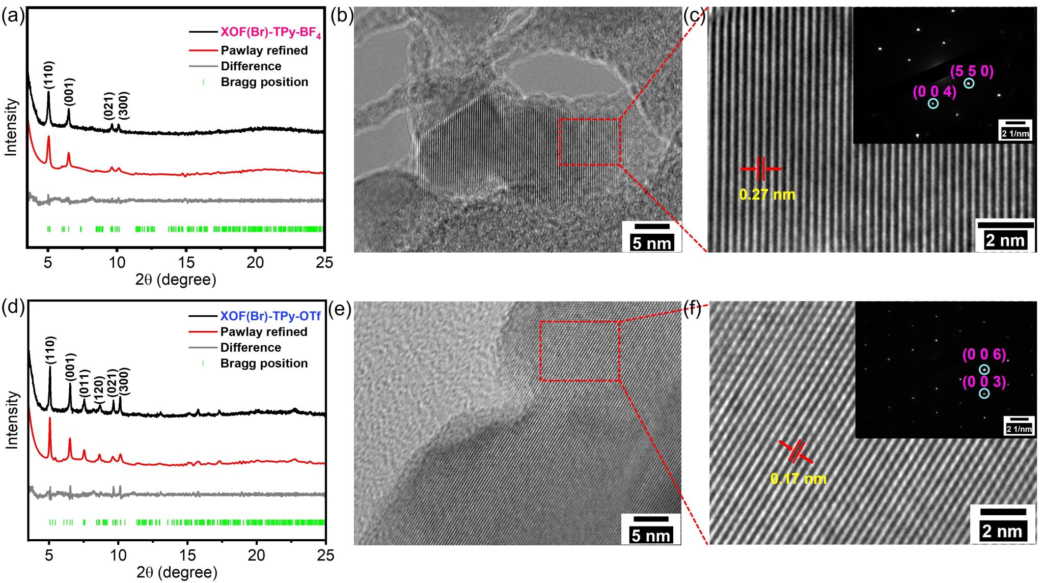 在该研究中,作者以TPy为连接单元,向其中加入Ag+并配位生成[N⋯Ag⋯N]+桥连的MOF结构,进而用Br+原位替换MOF的Ag+离子形成以[N⋯Br⋯N]+桥连XOF结构。成功构建了一种新的二维卤键有机框架(XOF(Br)-TPy-BF4/OTf)。作者通过1H NMR,UV-Vis,XPS,IR,SEM,TEM,HRTEM和SAED进行监测,证明了XOF(Br)-TPy-BF4/OTf的形成,同时,通过粉末X射线衍射(PXRD)和理论模拟研究,进一步确立了XOF(Br)-TPy-BF4/OTf的结构。