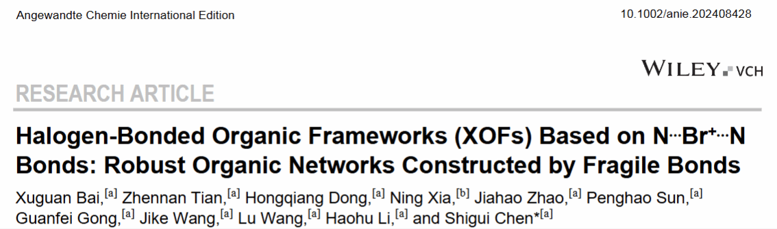 近日,国际权威期刊Angewandte Chemie International Edition (《德国应用化学》)在线发表了5g影院 陈世贵课题组在新型卤键有机框架 (XOF)领域取得的最新成果,论文标题为“Halogen-Bonded Organic Frameworks (XOFs) Based on N⋯Br+⋯N Bonds: Robust Organic Networks Constructed by Fragile Bonds”,(DOI: 10.1002/anie.202408428)。