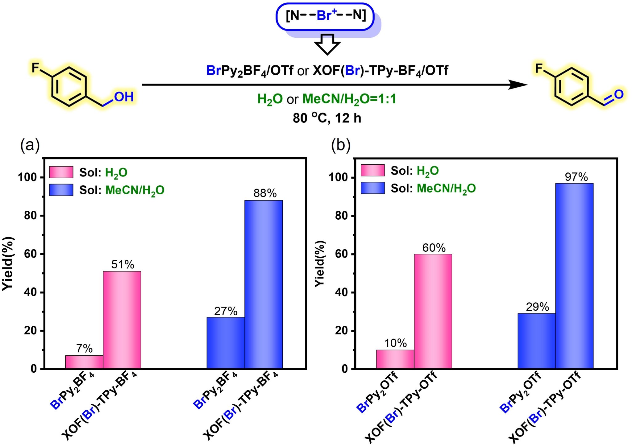 基于此,5g影院 陈世贵课题组首次基于敏感的[N⋯Br⋯N]+卤键构建了稳定的溴(I)桥联二维(2D)卤素键有机框架XOF(Br)-TPy-BF4/OTf。这种XOF结构不仅展示了良好的结晶性,并在各种有机溶剂和宽pH范围的水溶液中保持稳定,远超BrPy2BF4/OTf的稳定性。这使得XOF(Br)-TPy-BF4/OTf在水环境中能高效氧化苄醇,扩展了卤键有机框架的应用潜力。