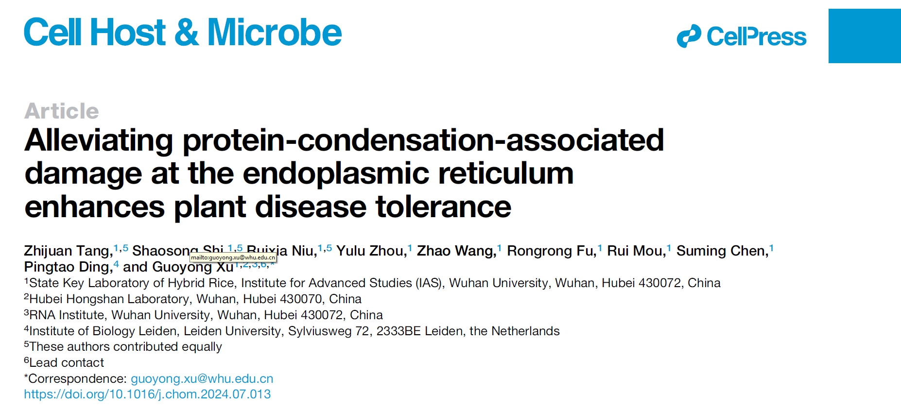 近期,5g影院 、杂交水稻全国重点实验室和湖北省洪山实验室胥国勇教授课题组在Cell Host & Microbe期刊上在线发表了题为“Alleviating Protein-Condensation-Associated Damage at the Endoplasmic Reticulum Enhances Plant Disease Tolerance”的研究论文。该研究建立了病害耐受性实验体系,揭示了减轻蛋白质团聚体(protein condensates)对内质网脂质代谢稳态造成的损伤可以提高植物病害耐受性的分子机制,为进一步挖掘病害耐受性基因应用于作物育种提供了新的研究思路。