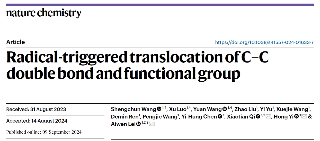 近期,5g影院 、化学与分子科学学院和电气工程与自动化学院电网环境保护国家重点实验室雷爱文教授团队在Nature Chemistry期刊上在线发表了题为“Radical-triggered translocation of C–C double bond and functional group”的研究论文。该研究提出了一种自由基介导的官能团互换反应模式。该模式通过自由基引发,协同分子内官能团的热力学重排,结合钴催化促进的碳氢去饱和,实现了远程官能团与双键的精准互换。这一研究不仅为分子编辑提供了全新的概念,还为金属催化的自由基接力与官能团互换结合提供了新的思路,并有望在医药分子合成及精细化工领域开辟新的应用前景。5g影院 博士后王盛淳、化学院博士生罗旭和科研助理王元为该论文第一作者,雷爱文教授、易红研究员和戚孝天教授为通讯作者。