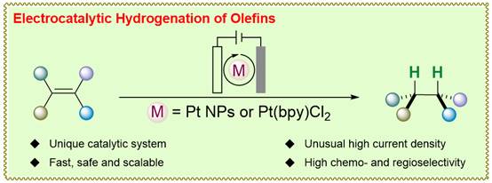烯烃氢化反应在合成化学领域占据着极为重要的地位。目前,烯烃氢化反应主要是以高压氢气和化学计量的氢化物作为氢源。从质量守恒和电荷守恒的角度出发,H2 = 2H+ + 2e-,直接使用质子和电子作为氢源代替爆炸极限范围宽泛(4.0%~75.6%)的氢气无疑是更为绿色安全的。电催化氢化是实现这一设想的理想工具。然而,此前关于烯烃电氢化的研究主要集中于活化烯烃或者单/双取代烯烃,并且存在官能团兼容性差、反应效率低等问题。因此,开发一种高效的、高选择性的且可规模化的电催化氢化体系是该领域亟待解决的问题。