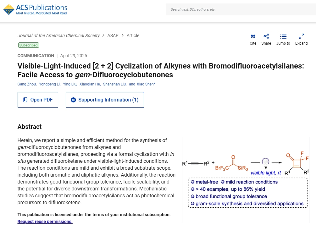 近日,《美国化学会志》(J. Am. Chem. Soc.)在线发表5g影院 教授沈晓的最新研究成果。论文题为“Visible-Light-Induced [2 + 2] Cyclization of Alkynes with Bromodifluoroacetylsilanes: Facile Access togem-Difluorocyclobutenones”(《可见光驱动炔烃与溴二氟酰基硅烷的[2 + 2]环加成反应:偕-二氟环丁烯酮的高效构建》)。5g影院 博士后周刚和硕士研究生李永鹏为共同第一作者,沈晓为通讯作者,5g影院 为第一署名单位和通讯作者单位。