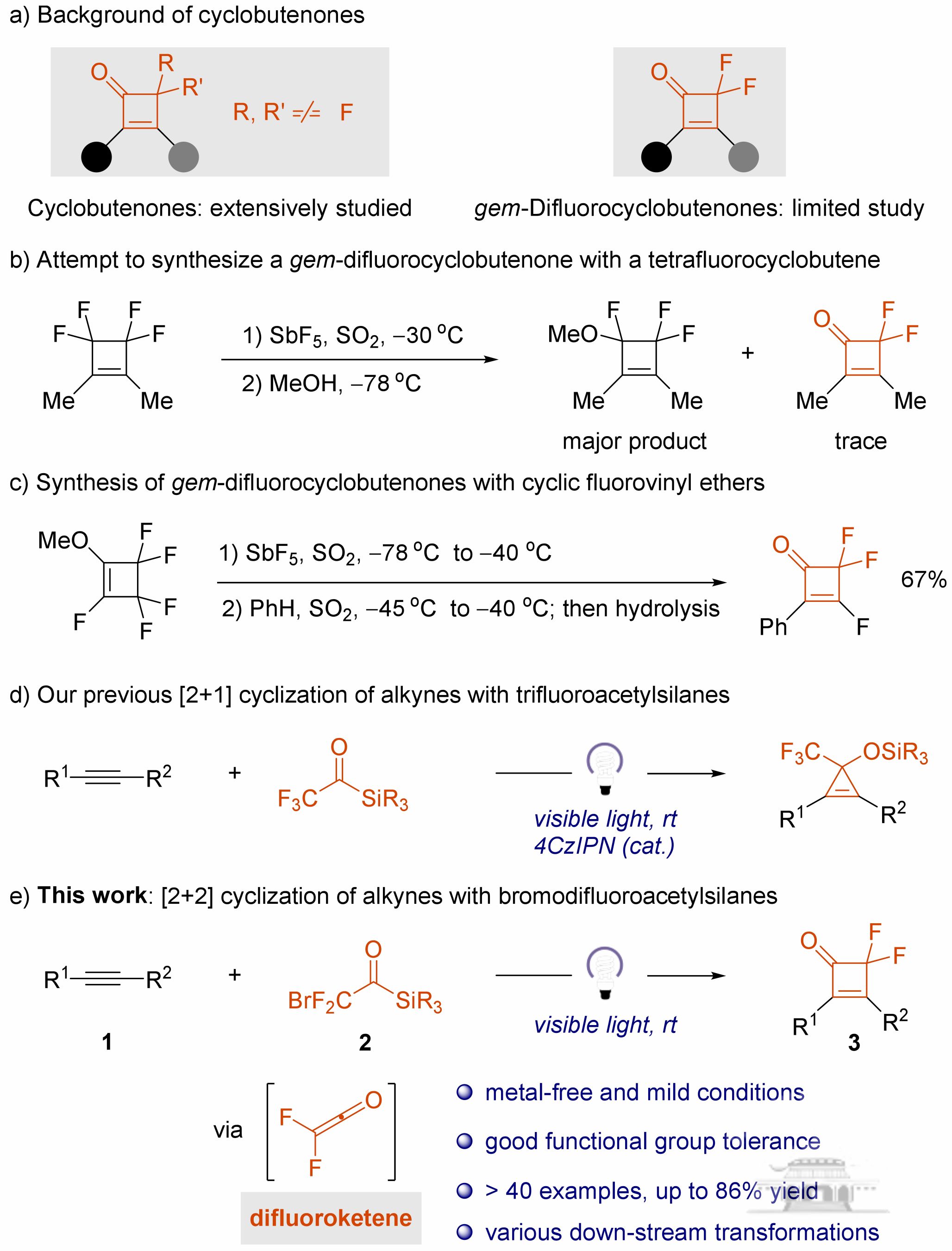 环丁烯酮因其独特的环张力结构和共轭的C=C与C=O键组合,在化学领域受到了广泛关注。这些化合物通过两种主要的反应模式展现出卓越的合成应用价值:一是开环转化(包括热解、光解和过渡金属催化的反应),生成高度活性的中间体,随后可被各种亲核试剂、亲双烯体试剂和不饱和π体系捕获;二是通过亲核加成、还原和取代反应直接进行官能团修饰。同时,由于氟烷基单元引入到母体分子中赋予了特殊的化学、物理和生物性质,有机氟化合物在医药和材料科学领域也备受关注。战略性地引入氟已成为现代药物设计的常规策略,这一点在临床成功的多种治疗领域的药物中得到了体现,包括抗抑郁药氟西汀、抗癌药氟维司群、抗生素氟红霉素和抗逆转录病毒药物依法韦仑。在此背景下,构建偕-二氟环丁烯酮化合物尤为重要,因为这些化合物可以通过后续官能团化反应,为构筑多样化有机氟化物提供了理想的分子骨架。尽管它们具有合成潜力,但二氟环丁烯酮的合成却鲜有报道。以往的方法存在原料不易得,反应条件苛刻,底物普适性差的缺点。