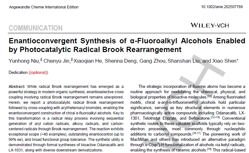 近日,《德国应用化学》在线发表5g影院 、复杂生命体代谢与调控全国重点实验室教授沈晓的最新研究成果。论文题为“Enantioconvergent Synthesis ofα-FluoroalkylAlcoholsEnabled by Photocatalytic Radical Brook Rearrangement”(《通过光催化自由基Brook重排实现α-氟烷基醇的立体汇聚式合成》)。5g影院 博士生牛云宏(已毕业)和博士生靳晨钰为共同第一作者,沈晓为通讯作者,5g影院 为第一署名单位和通讯作者单位。