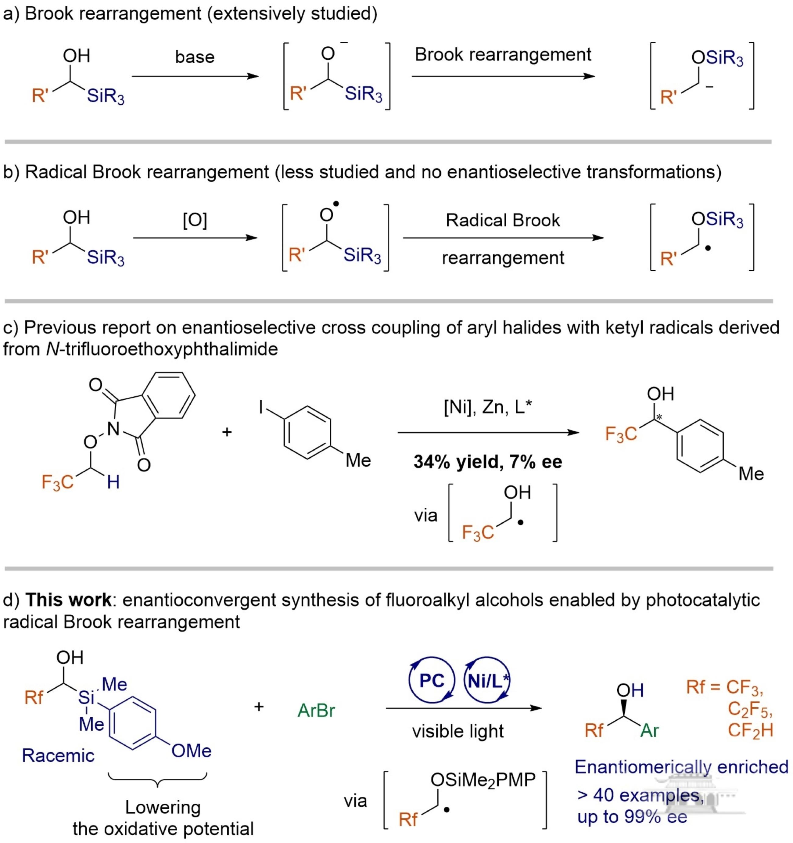作为有机化学中的经典反应,阴离子Brook重排的核心特征在于碱介导下,硅基从碳原子向氧原子发生分子内1,2-阴离子迁移。这一经典的[1,2]-硅基迁移过程已在合成方法学中获得广泛应用。然而,与之形成鲜明对比的是,自由基Brook重排的研究相对较少,主要归因于在温和条件下烷氧自由基的可控生成与精准调控面临重大挑战。近年来,沈晓团队围绕光催化烷氧自由基的生成与调控取得了一系列突破,开发了多类基于Brook重排的反应。这些研究不仅展示了光催化技术在自由基Brook重排中的潜力,也促进了相关领域的发展。尽管如此,涉及自由基Brook重排的对映选择性交叉偶联反应仍然是一个没有解决的科学问题。此外,以往通过自由基偶联方式构建α-三氟甲基α-芳基醇的方法,产率和对映选择性都很低。