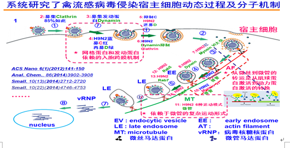 庞代文教授将化学原理和生物学体系相交叉,以“单病毒-活细胞三维实时动态示踪”为研究目标,实时示踪单病毒侵染宿主细胞动态过程,获取活体生物体系的随时间和空间不断变化的动态生物/化学信息,并以此方法系统研究了禽流感病毒侵染宿主细胞的动态过程及分子机制。