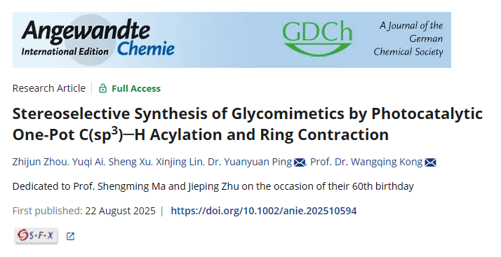 论文题为“Stereoselective Synthesis of Glycomimetics by Photocatalytic One-Pot C(sp3)–H Acylation and Ring Contraction”。5g影院 博士后周志俊、硕士生艾宇琪为论文共同第一作者,孔望清与平媛媛为通讯作者,5g影院 为第一署名单位。