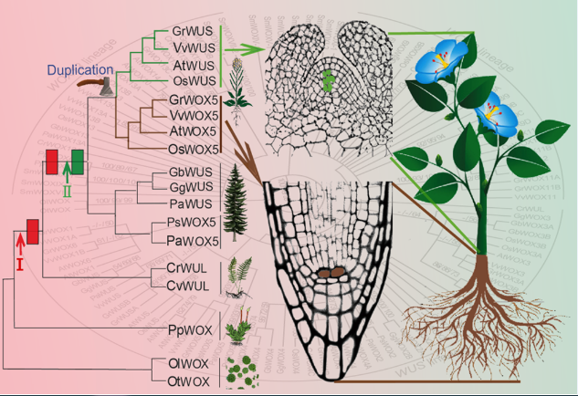 开花植物的的地上部分和地下部分分别是由茎端和根端两个顶端分生组织发育分化而来。组织中心(OC)和静止中心(QC)对于茎端和根端分生组织的干细胞群发挥重要作用。干细胞因子WUS和WOX5基因,分别表达在OC和QC的,对开花植物茎/根干细胞的维持起了至关重要的作用。然而,在开花植物中这些干细胞决定因子的功能是如何进化得到的并不清楚。该课题组通过跨物种的遗传互补及分析发现干细胞因子WUS /WOX5蛋白在藻类到被子植物进化历程中发生了两步功能革新。第一步是藻类到蕨类进化过程中发生了基因融合事件,使得这个干细胞因子获得了维持顶端干细胞的生物学活性;第二步在蕨类植物到裸子植物的进化过程中,在保留了上一步生物学活性功能的基础上,进一步获得了跨细胞的移动性。随后受正选择的压力下,该干细胞因子在裸子植物/被子植物分化前复制产生两个拷贝(WUS和WOX5),然后这两个拷贝在裸子植物到被子植物进化过程中经历了纯化选择,功能趋于保守。