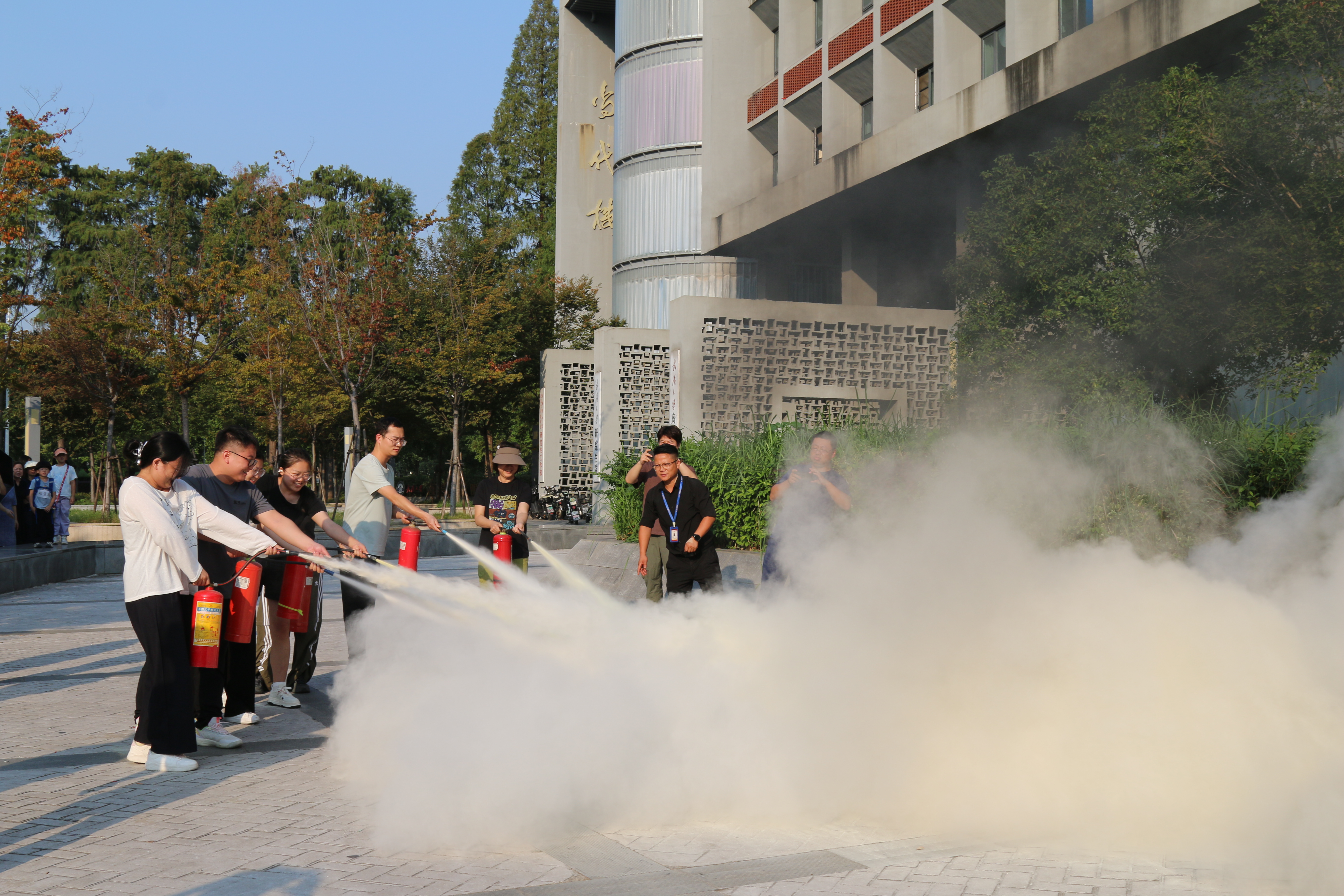 最后,普消消防教员王坤结合近年典型火灾事故案例,深入浅出地介绍了火灾成因和应对措施。在实操演练环节,同学们有序转移至当代楼外指定空地,王教员现场演示了消防器材的规范操作,重点讲解了干粉灭火器“一提、二拔、三握、四压”的使用步骤。参训同学分批进行了灭火器实操练习,实现了新生全员动手、人人过关的培训目标,显著提升了扑救初期火灾的实际操作能力。