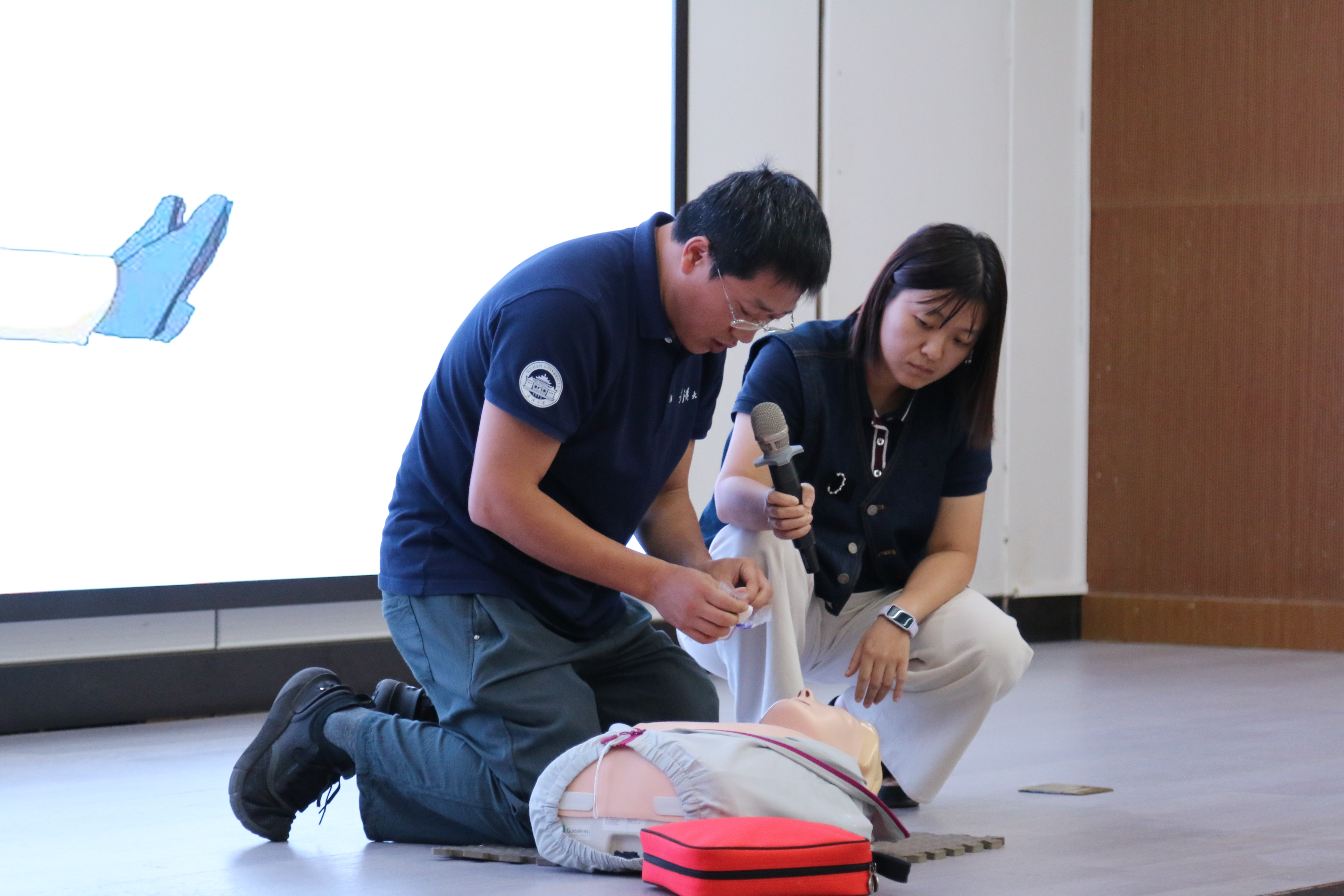 护理学院张旭老师聚焦“事故现场常用急救技能”,为新生普及现场急救基本概念与核心原则,详细拆解徒手心肺复苏术(CPR)及气道异物梗阻的处置步骤。同时,张老师还通过现场实操演示,直观展示了徒手心肺复苏与自动体外除颤器(AED)的正确使用方法,有效增强了同学们在突发事故现场的应急救援能力。