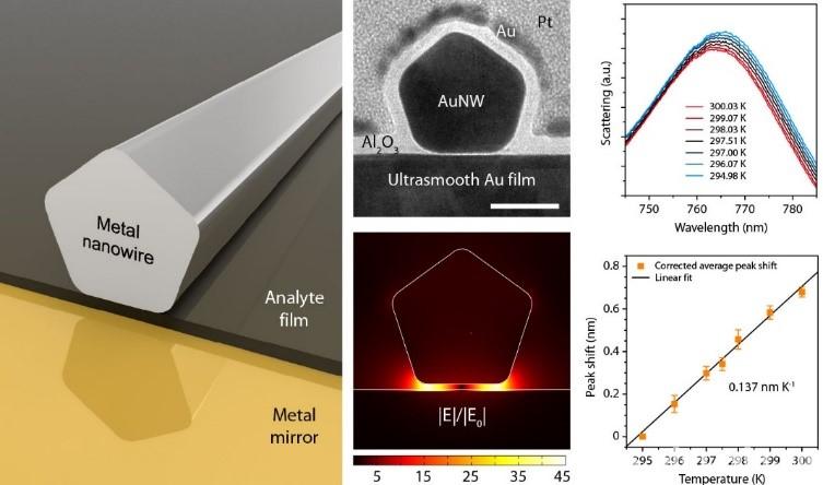 徐红星研究团队设计了金属纳米线-间隙材料层-超光滑金膜的三明治复合平板纳米腔结构,通过测量纳米腔等离激元散射光谱的共振峰的移动来测定间隙材料层的微小厚度变化。为了演示该体系的传感灵敏性,研究团队选择了一种具有较大热膨胀系数的聚合物纳米薄膜作为间隙材料层,改变样品的温度可使间隙材料层的厚度发生微小的变化。通过排除热膨胀引起的折射率变化对共振峰位的影响,实验上证实了这种纳米腔等离激元传感器可以原位测定亚皮米的厚度变化,比之前报道的等离激元尺子的亚纳米精度高了几个数量级,创造了新的世界纪录。
