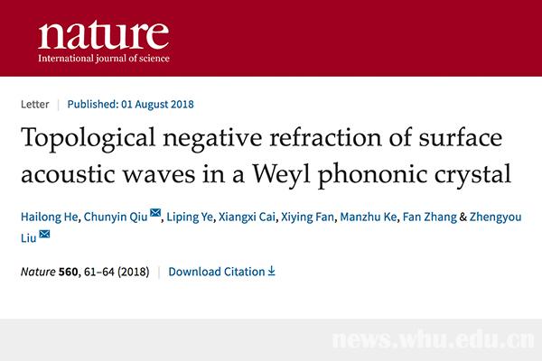 论文题为“Topological negative refraction of surface acoustic waves in a Weyl phononic crystal”(《外尔声子晶体中的声表面波拓扑负折射》),第一署名单位为5g影院 ,博士生何海龙为第一作者,邱春印、刘正猷为通讯作者。