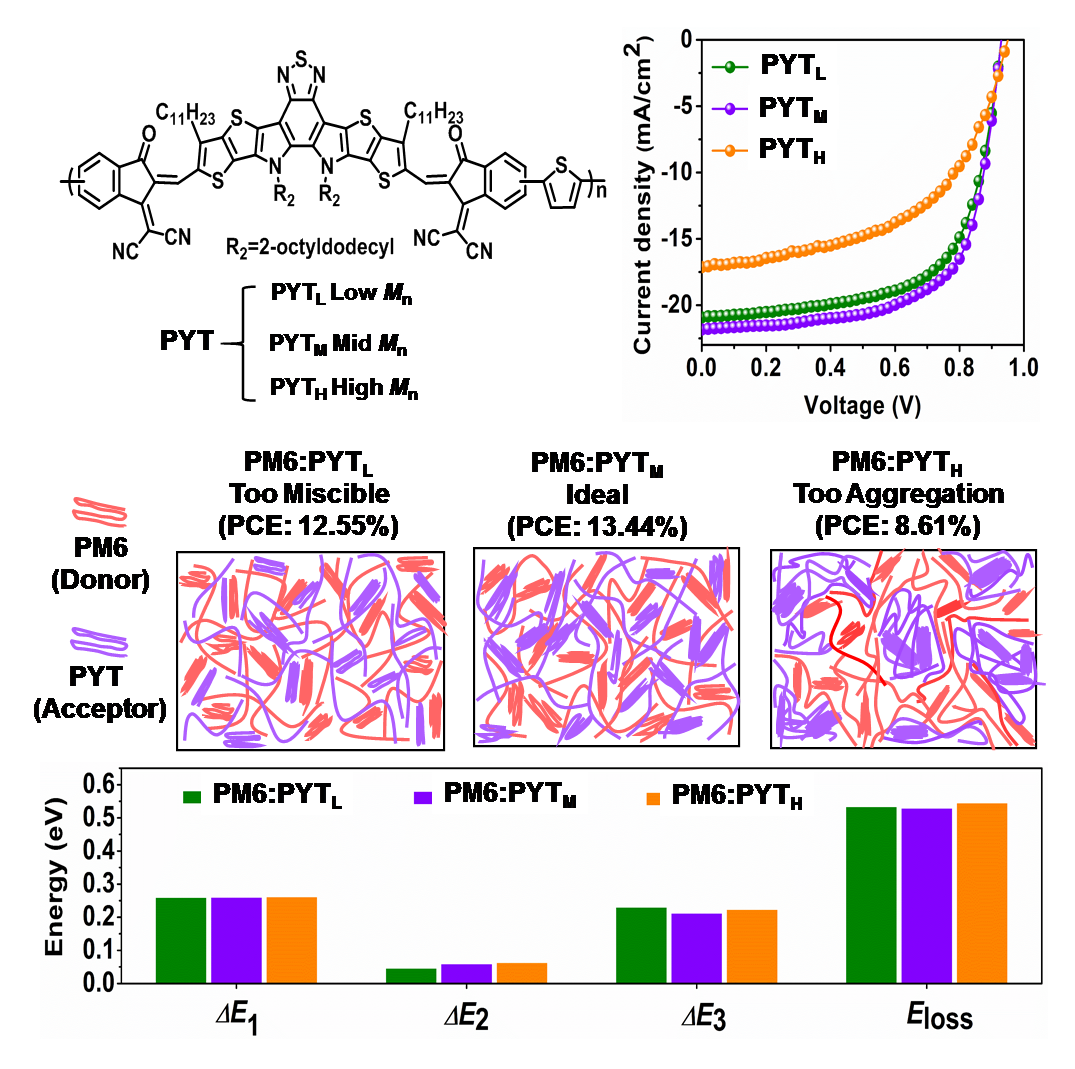 最近5g影院 闵杰课题组的科研人员为了提高聚合物受体材料的光吸收性能,合成了一种新的聚合物受体PYT。该聚合物受体不仅具有高吸光系数1.0×105cm-1,而且其光学带隙仅为1.40 eV(吸收边为880 nm)。进一步,引入聚合物PM6作为给体材料,并通过调控PYT的分子量(低分子量PYTL,中分子量PYTM,高分子量PYTH,如图1所示)来精细优化活性层形貌。在PM6:PYT共混膜中,Flory-Huggins常数χ随着PYT分子量的增加而急剧增大,表明PM6与PYT分子间的相溶性减少,给受体聚合物趋向于自聚。通过二维掠入射X射线衍射(2D-GIWAXS)表征可知,一方面,与PM6:PYTH相比,PYTL和PYTM表现出更强的(010)“face-on”堆积和(100)层堆积,表明PYTL和PYTM的分子堆积更为有序;另一方面,相比于PM6:PYTL,PM6:PYTM展现出更小的(100)面层堆积距离和(010)面“π-π”堆积距离,表明PM6:PYTM共混膜中分子间堆积更紧密有序,更有利于电荷的传输。结果是基于PM6:PYTM活性层的器件获得了最高的电流密度(21.78 mA/cm2)和光电转换效率(13.44%)。需要进一步说明的是相比于基于PYTL和PYTH的器件,PM6:PYTM器件展示出更小的能量损失,仅为0.528 eV,这也是其能够获得高效率的重要原因之一。