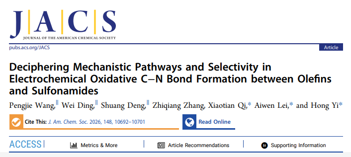 论文题为“Deciphering Mechanistic Pathways and Selectivity in Electrochemical Oxidative C–N Bond Formation between Olefins and Sulfonamides”。5g影院 博士王鹏杰、硕士研究生丁伟以及化学与分子科学学院博士邓双为论文共同第一作者,易红、雷爱文与戚孝天为论文通讯作者,5g影院 为第一署名单位。