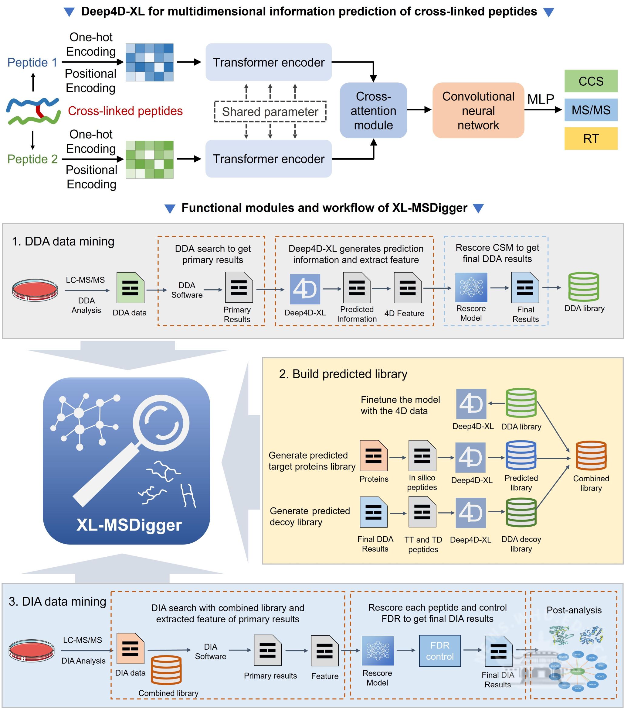 针对结构更为复杂的化学交联肽(同时含两条肽段信息、连接位点不固定、异构形式多样),该团队进一步开发了Deep4D-XL深度学习模型(Nat. Commun.2026, 17, 2554)。该模型创新性地引入孪生网络结构分别表征交联肽的两条肽段,再通过交叉注意力模块融合特征,最后经解码模块输出多维预测。该模型在保留时间预测上与实验值相关性达到R²= 0.97,CCS预测中位相对误差为1.52%,碎片离子强度预测中位点积达0.88。以Deep4D-XL为核心,该团队开发了支持数据依赖采集(DDA)和数据非依赖采集(DIA)模式的交联质谱智能分析平台XL-MSDigger。在DDA分析中,利用多维预测信息提取16个特征,通过深度神经网络重打分,使蛋白质间交联肽谱图匹配数提升107%,蛋白质-蛋白质相互作用鉴定数增加76.3%。在DIA分析中,首次建立了交联肽错误发现率系统评估框架,通过重打分使鉴定数提升约5倍,并实现了基于预测谱库的DIA交联肽分析,鉴定出90条DDA分析未检出的蛋白质内交联肽和多个高置信度蛋白质-蛋白质相互作用。Deep4D-XL是首个公开发表的交联肽多维信息深度学习预测模型。通过高精度多维信息预测实现了此前方法无法实现的交联肽鉴定多维信息重打分,以及诱饵库生成和错误发现率控制环节,在异构体水平显著提升了交联肽结构鉴定的可信度。