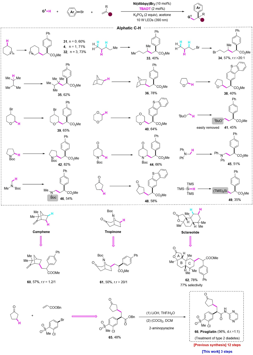 在最优条件下,作者对烷烃部分进行了底物范围的考察。对于普通的环状、链状以及带有桥环的烷烃,都能有着中等至良好的收率,其中1-溴丁烷以高选择性地得到三组分产物(r.r.>20:1),此外,具有缺电子基团的环戊酮能够单一地得到β位官能团化的产物。杂原子α位的C-H键同样适用该体系,值得一提的是,Boc保护的二甲胺以及叔丁基保护的甲醇首次实现该类型的三组分反应,其三组分产物可以进一步实现五元环的内酰胺以及内酯的合成。为了展现该方法学在合成上的应用价值,作者随后实现了一系列复杂天然产物的后期功能化修饰,能以良好的选择性得到三组分产物。最后,从商业可得的原料出发,该方法学仅需三步就能实现了2型糖尿病药物分子Piragliatin的合成。