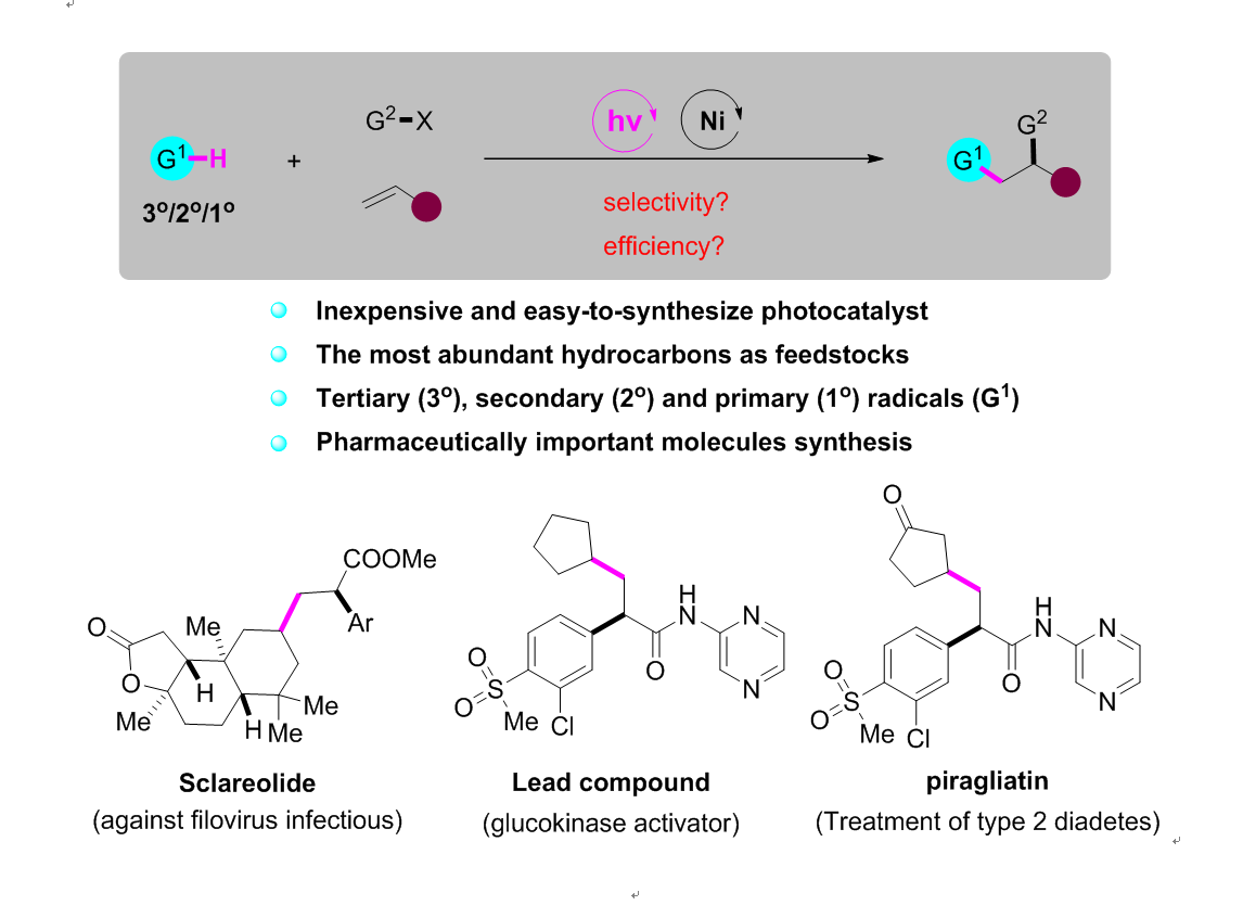 为了解决上述存在的问题,理想的策略是实现烷基C-H键直接参与的烯烃双官能团化反应。然而在无导向基团参与条件下实现高选择性的碳氢键官能团化,一直是有机化学领域非常具有挑战性的课题。近年来,廉价的光催化剂十钨酸四丁基铵(TBADT)通过氢原子转移(HAT)策略实现C(sp3)-H官能团化的反应被广泛研究,但是三组分的偶联反应还鲜有报道。5g影院 孔望清课题组一直致力于烯烃的双官能团化反应的研究(J. Am. Chem. Soc., 2018, 140, 12364; ACS Catal. 2019, 9, 7335; ACS Catal., 2019, 9, 9127; Org. Lett., 2019, 21, 7498.),近日,该课题组通过HAT策略活化脂肪烃C(sp3)-H,实现了Ni催化的烯烃分子间烷基芳基化反应。该反应底物范围广,对三级、二级和一级烷基自由基均能很好地兼容,这是之前的方法所无法实现的。利用该反应,该课题组还实现了一系列复杂天然产物分子的后期功能化修饰;并通过三步反应实现了2型糖尿病药物分子Piragliatin的高效合成。