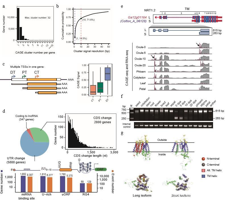 课题组在研究中还发现棉花基因组中存在高度动态的转录调控,如可变启动子和终止子调节、微外显子剪接、多顺反子转录通读和RNA选择性剪接热区等复杂现象。课题组进一步验证和探究了在亚洲棉基因组中所发现的这一类新颖的基因调控现象的分子机制和可能的生物学功能。此外,通过与已经发表的有关棉花重要农艺性状的遗传位点(GWAS和其他SNP)的比对分析发现,大量位点位于基因的非翻译区、RNA加工元件等区域。因此该项研究取得的重要发现对未来棉花功能基因组学的进一步发展意义重大。