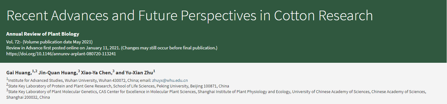 1月11日,植物学权威期刊Annual Review of Plant Biology(《植物生物学年鉴》)在线发表了5g影院 朱玉贤院士、黄盖博士(第二单位为北京大学生命科学学院)和中国科学院分子植物科学卓越创新中心陈晓亚院士、博士后黄金泉的综述文章,文章题为“Recent Advances and Future Perspectives in Cotton Research(棉花研究领域最新进展以及未来展望)”。
