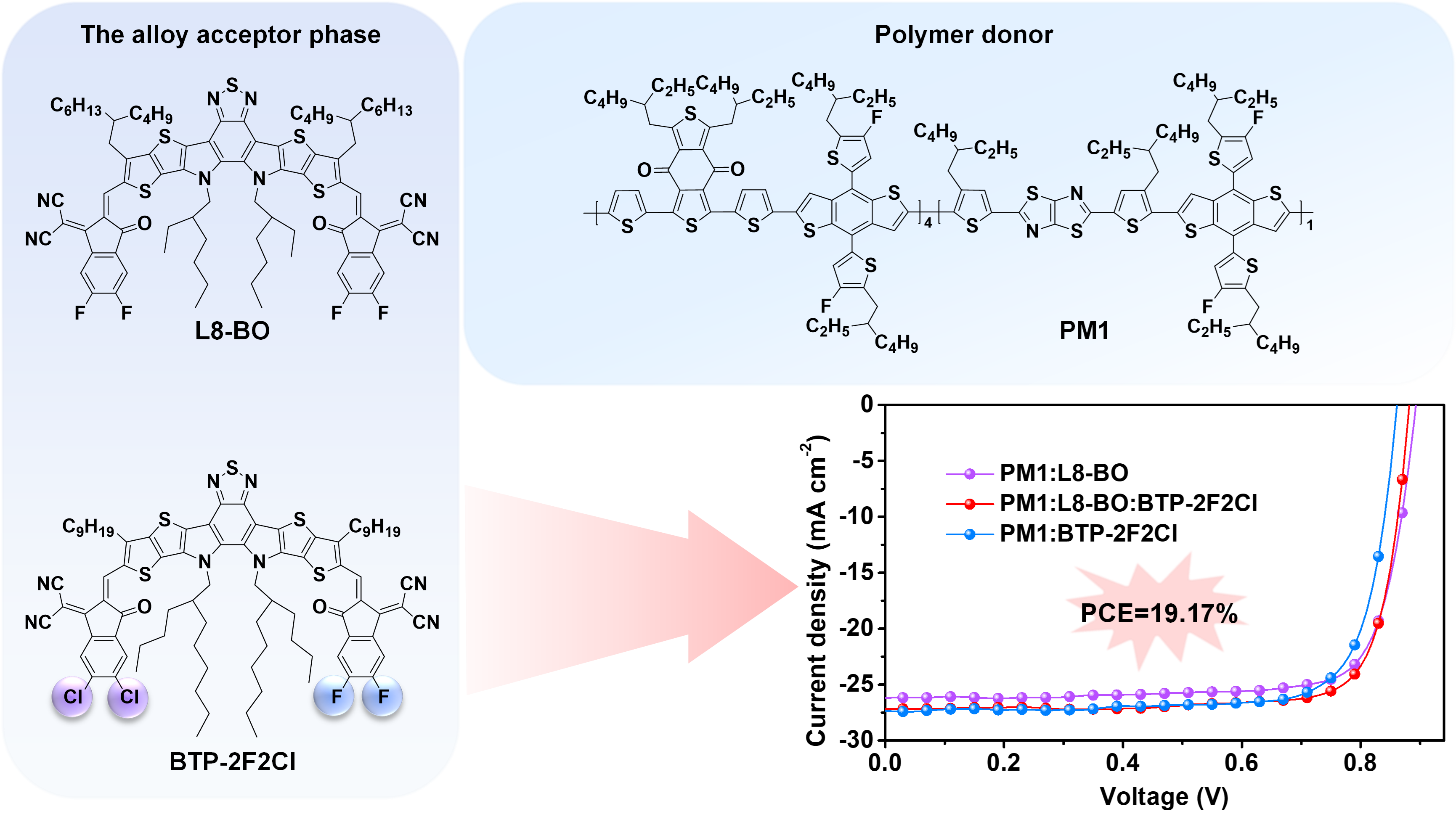 鉴于此,闵杰课题组通过在基于PM1:L8-BO主体混合物中引入一种新型不对称客体受体BTP-2F2Cl,制备出高效的三元OSCs(图1)。值得注意的是,BTP-2F2Cl的带隙比L8-BO窄,因而可以拓宽PM1:L8-BO混合物的吸收光谱。此外,与L8-BO相比,L8-BO:BTP-2F2Cl共混膜具有更合适的HOMO偏移、更高的光致发光量子产率(PLQY)和增加的激子扩散长度(LD),这有利于抑制三元共混物中的非辐射电荷复合。该课题组还系统地研究了共混物的相分离形貌,并对光活性层进行了物理动力学测量。最终,三元OSCs器件PCE明显高于二元体系,达到了创纪录的19.17%(中国计量科学院第三方认证效率18.7%)。除此之外,三元体系还表现出更好的运行稳定性,在250小时的光照条件下,效率仍能保持初始值的83%。