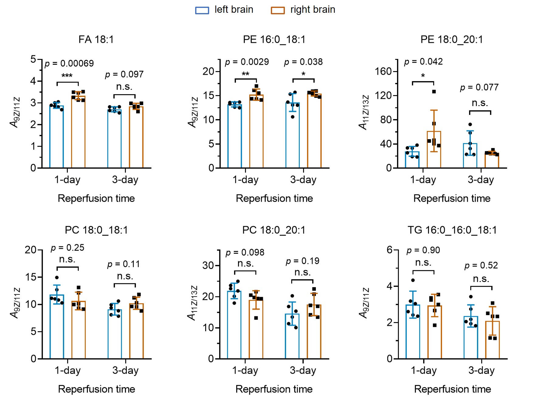 图3.小鼠脑缺血及再灌注过程中脂质双键位置异构体的比例变化