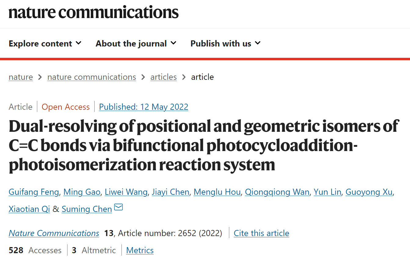 近日,Nature Communications(《自然•通讯》)在线发表了5g影院 陈素明教授课题组在化学、生物学和医学学科交叉研究的最新成果,论文题为“Dual-Resolving of Lipid Positional and Geometric Isomers of C=C Bonds via Bifunctional Photocycloaddition-Photoisomerization Reaction System”。该研究利用开发的双功能化学反应和色谱-质谱联用技术,解决了在生命科学研究中长期存在的不饱和脂质双键顺反异构大规模分析鉴定的难题,进而实现了脂质双键异构的全维度分析,为研究脂质异构体的生物功能提供了重要的分析方法。