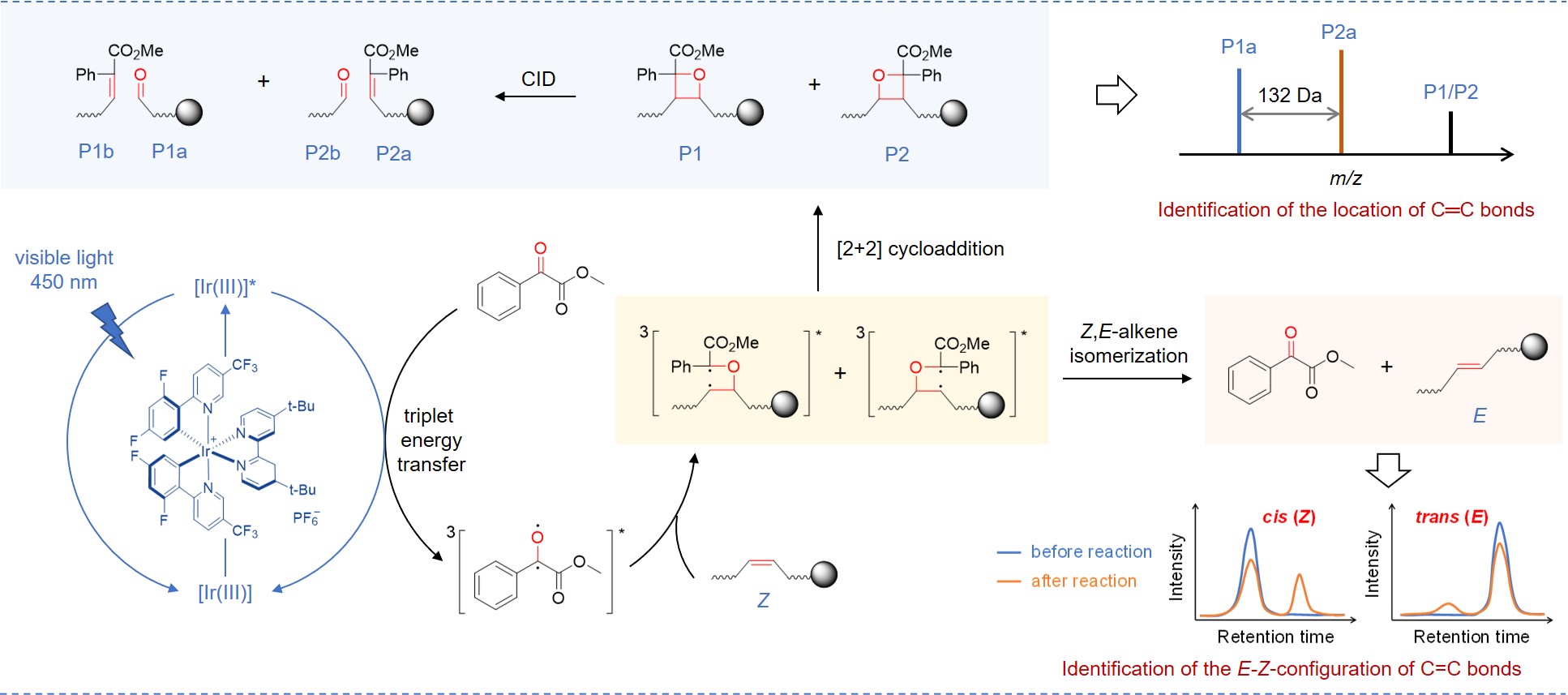 鉴于上述脂质双键异构体分析的难题,他们开发了一种可见光激发的光环化-光异构化双功能反应体系,结合液相色谱-质谱联用技术,首次在组学水平上实现了不饱和脂质双键位置异构和顺反异构的同时分析(图1)。他们发现,在光催化剂Ir[dFppy]2(dtbbpy)PF6存在下,可见光照射时,苯甲酰甲酸甲酯(Methyl Benzoylformate)可以通过催化剂的三线态能量转移被激发到三重激发态。随后,其上的羰基与不饱和脂质上双键发生[2+2]环加成反应,生成双自由基中间态。该中间态会经历两个反应历程,其一是生成氧杂环丁烷结构的产物。利用该光环加成产物结合质谱碰撞诱导解离,可以实现双键位置的鉴定。更重要的是,该碳中心自由基还会发生β-裂解并导致烯烃异构化,生成双键构型翻转的产物,即顺式和反式构型可以发生互相转化。而生成的顺式或反式光异构化产物在色谱上与其反应物相比,具有不同的保留行为。反式产物比顺式反应物的保留时间更长,会在其右边出现新的色谱峰;而顺式产物的保留时间比反式反应物短,会在其左边出现新的色谱峰;且顺式转化为反式的产率要远远大于反式转顺式的产率。据此特异性,可以为不饱和脂质顺反异构体引入第二维度的身份标签,实现其可靠的鉴定分析。基于这种新的分析策略,他们建立了复杂生物体系中不饱和脂质双键异构的全维度分析方案。