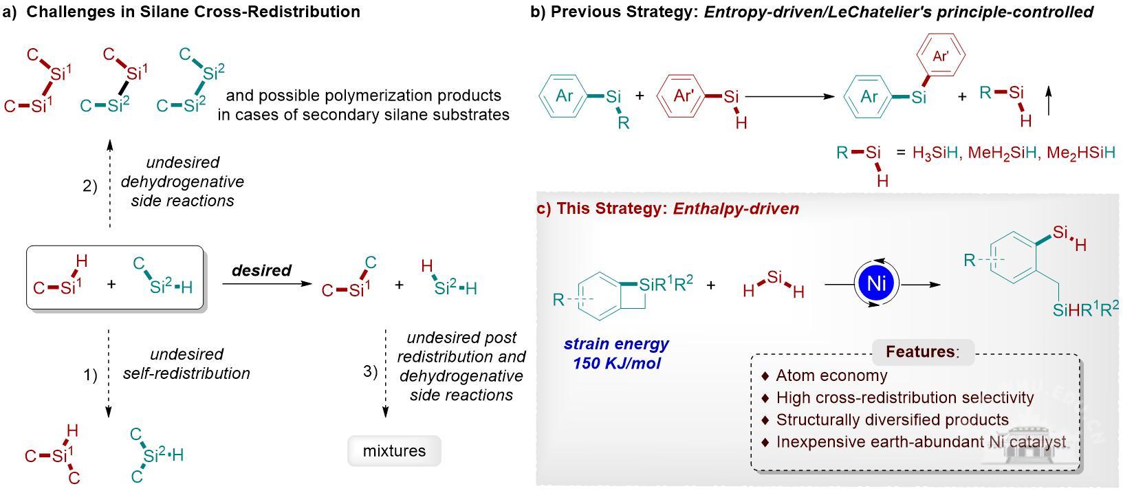 有机硅化合物在化学工业和材料科学中具有重要的价值。具有Si-H键的有机硅烷在各种转化中作为氢原子或者氢化物给体尤其重要。就像强大的烯烃复分解反应可以从廉价的烯烃获得高附加值的烯烃一样,选择性的硅烷再分配反应(即硅氢键和硅碳键的交换)也可能具备从两个简单硅烷制备高级硅烷的潜力。尽管HSiCl3的自身再分配反应已经是制备SiH4的工业手段,但选择性交叉再分配反应仍是一个巨大的挑战。要获得高的交叉再分配选择性,需要克服以下几个困难(图1):一是如何抑制自身再分配反应;二是如何抑制硅烷脱氢偶联的副反应;三是如何避免新形成的硅氢键的过度反应。