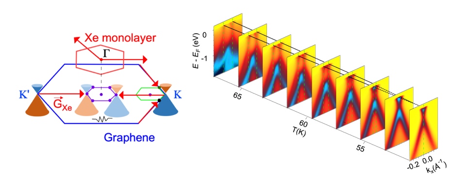 最近,通过在单层石墨烯上原位生长氙单原子层并开展ARPES测量,课题组首次实现了摩尔周期原位大范围可调节的高阶摩尔效应。通过原位退火调节氙单原子层的晶格常数的方式,高阶摩尔效应的周期可以从纳米级别调制到无穷大。ARPES在布里渊区中心附近观测到狄拉克复制能带,随着摩尔周期变大而逐渐靠近并最终重合。理论模型指出,类比于转角石墨烯中狄拉克费米子的层间相互作用,石墨烯-氙单原子层异质结中狄拉克费米子的能谷间耦合也可以在大摩尔周期条件导致摩尔窄带,有望实现新奇的关联电子物态。该工作发现了一个研究摩尔条纹连续演变的新平台,并为调制狄拉克费米子的能谷间耦合提供了新方法。