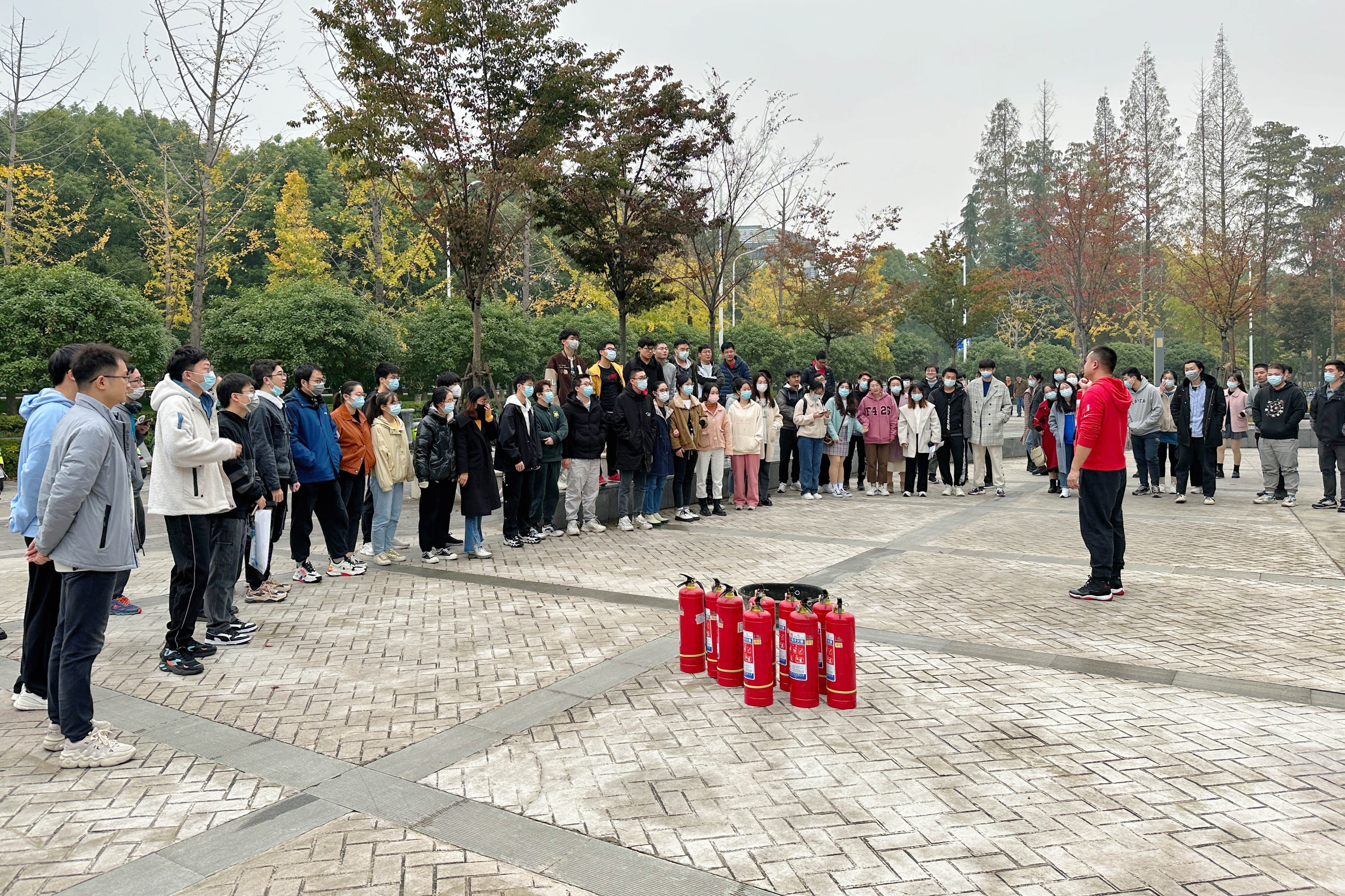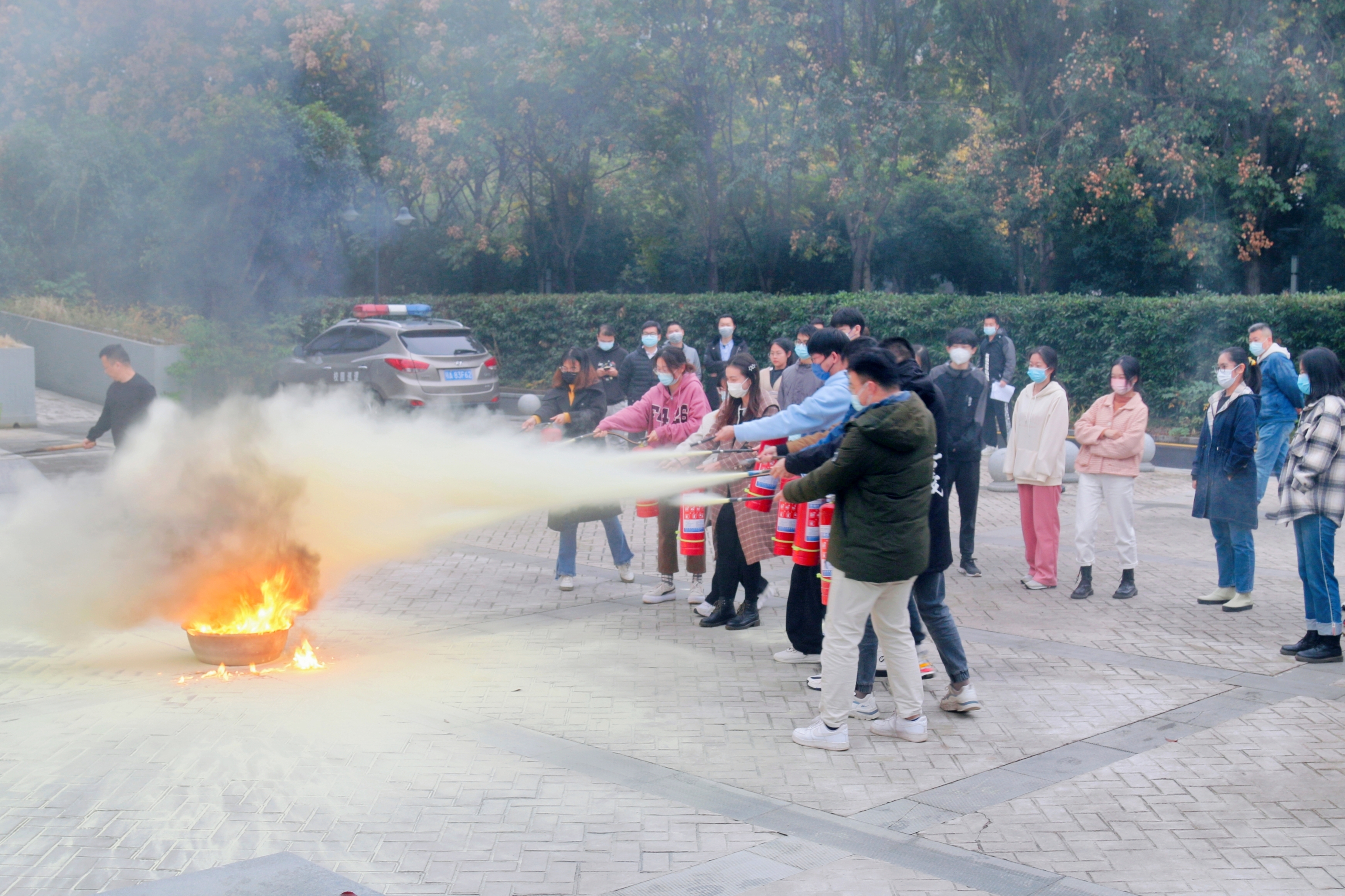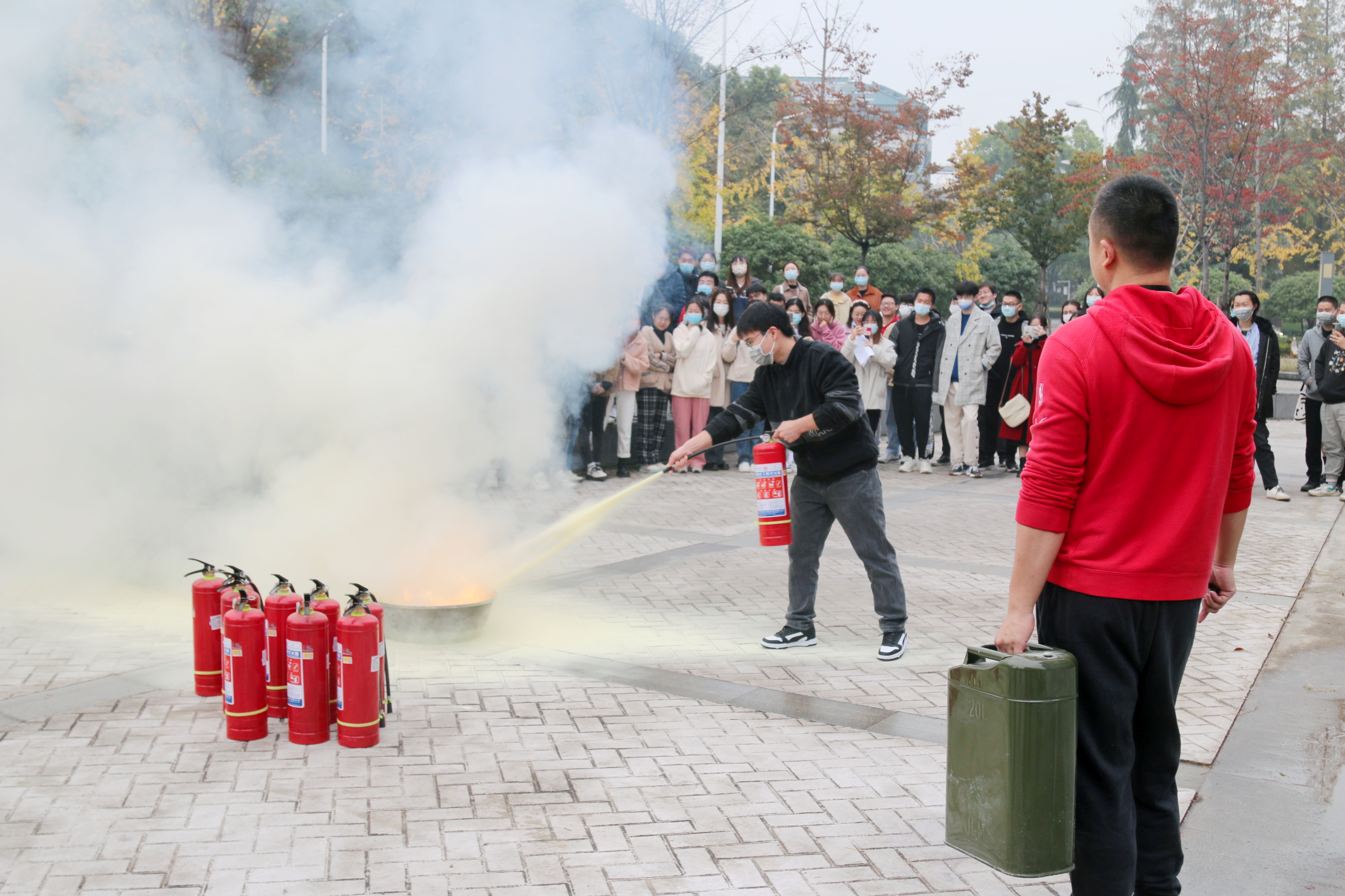 耳闻目见终觉浅,绝知此事要躬行。在保卫部工作人员的示范指导下,同学们来到当代楼外空地,了解干粉灭火器的使用步骤。“一晃、二瞄、三拉、四压”,同学们依次上手体验,扑灭现场明火,实现了动手实操的新生全覆盖。