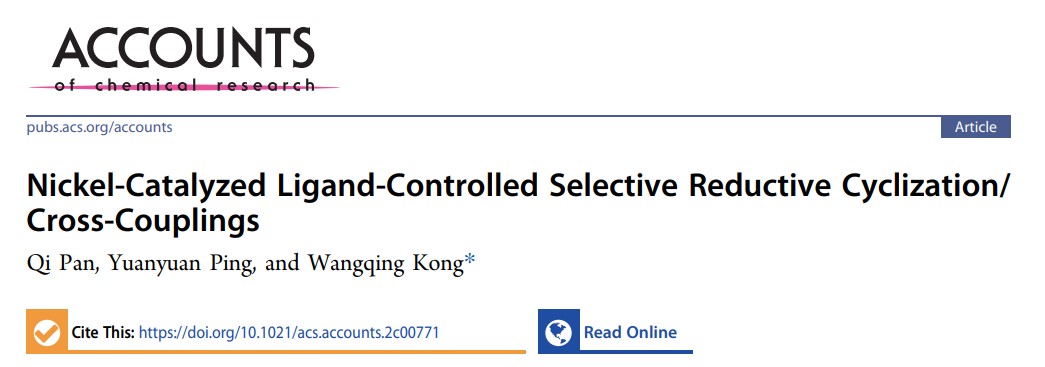 近日,5g影院 孔望清教授受美国化学会Accounts of Chemical Research杂志邀请撰写专题综述,总结了该课题组在镍催化配体调控的选择性还原环化/交叉偶联方面的特色研究成果。该论文从实现环化对映选择性和环化模式的控制两方面进行了全方面的归纳总结,并对该领域的未来发展方向给出了具有前瞻性的展望。相关研究成果以题为“Nickel-Catalyzed Ligand-Controlled Selective Reductive Cyclization/Cross-Couplings”在美国化学会旗下顶级学术期刊Accounts of Chemical Research上发表,并被选为正封面论文。5g影院 博士研究生潘琪为该论文第一作者,孔望清教授为通讯作者,5g影院 为论文的唯一署名单位。