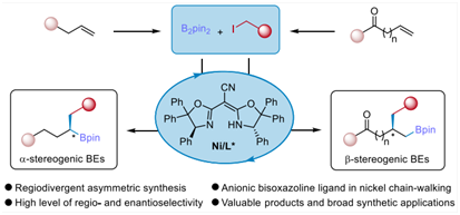 手性硼酸酯是一类用途广泛的合成砌块。通过对手性阴离子双噁唑啉配体的应用,该研究提供了一种使用容易获得的起始原料合成α-和β-手性硼酸酯的三组分策略。该策略具有反应条件温和、底物范围广、区域选择性和对映选择性高等特点。除此之外,该方法具有进一步简化药物分子及生物活性分子合成路线的潜力。机理研究表面,α-手性硼酸酯的生成是由立体收敛过程引起的;另外,烯烃迁移插入步骤中羰基酯对催化中心的配位实现了对β-手性硼酸酯生成的控制。