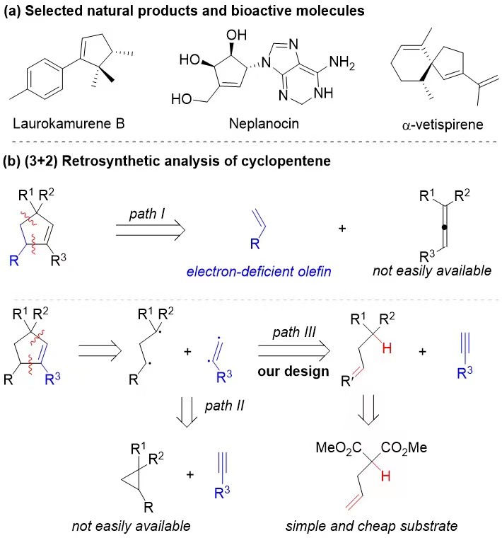 环戊烯是许多天然产物、生物活性和功能分子中常见的核心骨架,也是复杂分子合成中重要的合成砌块。由于环戊烯化合物的高附价值,许多化学家致力于探索合成环戊烯有效的合成路线。例如,Michael卡宾插入反应、Conia-ene反应、乙烯基环丙烷重排反应、过渡金属催化的环化反应以及膦催化的烯丙酸酯与缺电子烯烃的[3+2]环化等是合成环戊烯的有效方法。此外,研究者们通过使用C-X/C键断裂作为碳自由基前体,开发了一系列自由基介导的(3+2)环化加成反应构建环戊烯。尽管上述方法取得了很大进展,但是直接使用C-H化合物作为碳自由基源,通过(3+2)环化合成多官能团化的环戊烯是一种未被开发的绿色合成方法。