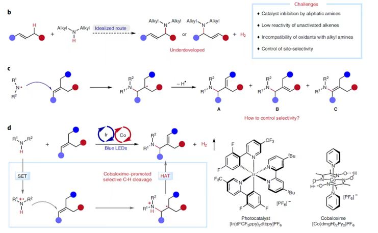 烷基烯丙胺是基本有机骨架,广泛存在于药物分子中。利用烷基胺和廉价烯烃构建烷基烯丙胺是一种理想方式,但却困难重重:(1)烷基胺具有较强配位性,容易导致催化剂失活;(2)三级烷基烯丙胺具有较强的氧化还原活性,产物容易氧化变质;(3)理想的氧化析氢偶联方式热力学不利;(4)自由基加成中间体双键重构选择性难以控制。