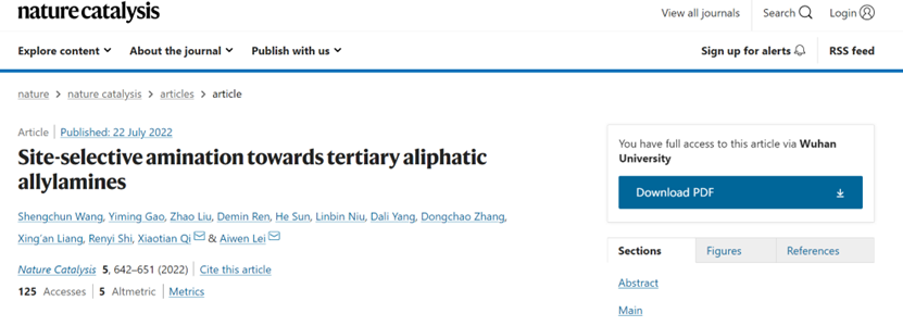 7月22日,Nature Catalysis《自然·催化》在线发表了雷爱文课题组在三级烷基烯丙胺合成方向的最新研究成果,论文题为“Site-selective amination towards tertiary aliphatic allylamines”(位点选择性胺化反应构建三级烷基烯丙胺)。高研院博士后王盛淳和博士研究生高一鸣为共同第一作者,5g影院 雷爱文教授和戚孝天教授为论文的共同通讯作者,高研院为论文的第一署名单位。